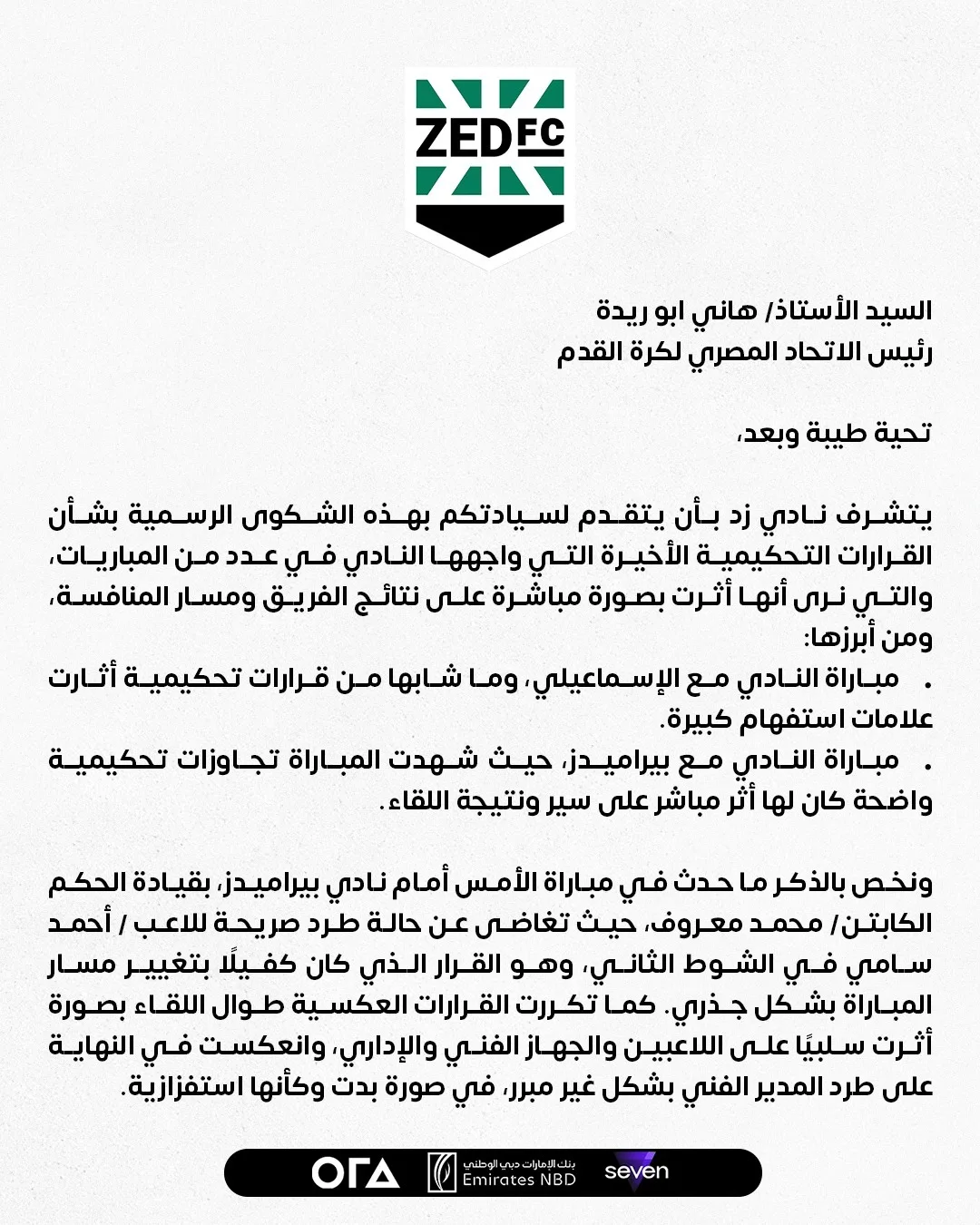 تقدم نادي زد بشكوى رسمية إلى اتحاد الكرة المصري برئاسة المهندس هاني أبو ريدة، ضد التحكيم المصري، وذلك تعقيبًا على القرارات الأخيرة التي واجهها الفريق في عدد من مبارياته ضمن منافسات الدوري، والتي أثرت بصورة مباشرة على نتائج المباريات وعلى مسار المنافسة بشكل عام.