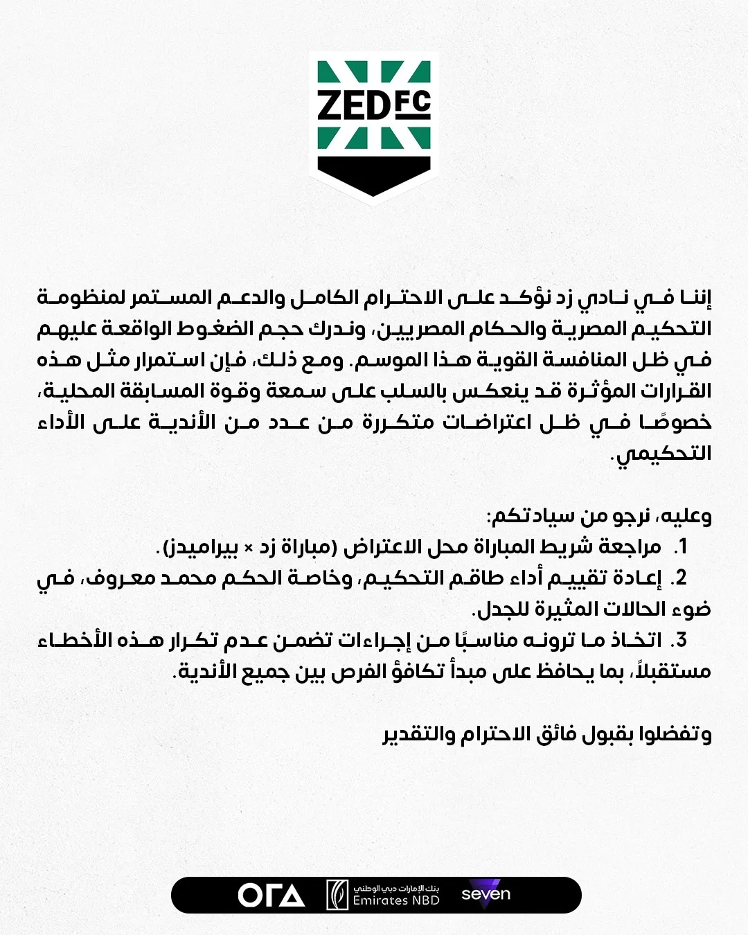 إننا في نادي زد نؤكد على الاحترام الكامل والدعم المستمر لمنظومة التحكيم المصرية والحكام المصريين، وندرك حجم الضغوط الواقعة عليهم في ظل المنافسة القوية هذا الموسم. ومع ذلك، فإن استمرار مثل هذه القرارات المؤثرة قد ينعكس بالسلب على سمعة وقوة المسابقة المحلية خصوصا في ظل اعتراضات متكررة من عدد من الأندية على الأداء التحكيمي.